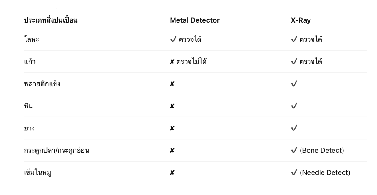 ถ้าต้องตรวจจับเศษแก้ว พลาสติกแข็ง หิน และโลหะอื่น ๆโรงงานที่ต้องการมาตรฐานสูง ควรมีทั้ง Metal Detector เพื่อตรวจโลหะ และ X-Ray Inspection เพื่อตรวจ แก้ว หิน และพลาสติกแข็ง ให้ครอบคลุมความปลอดภัยสูงสุด